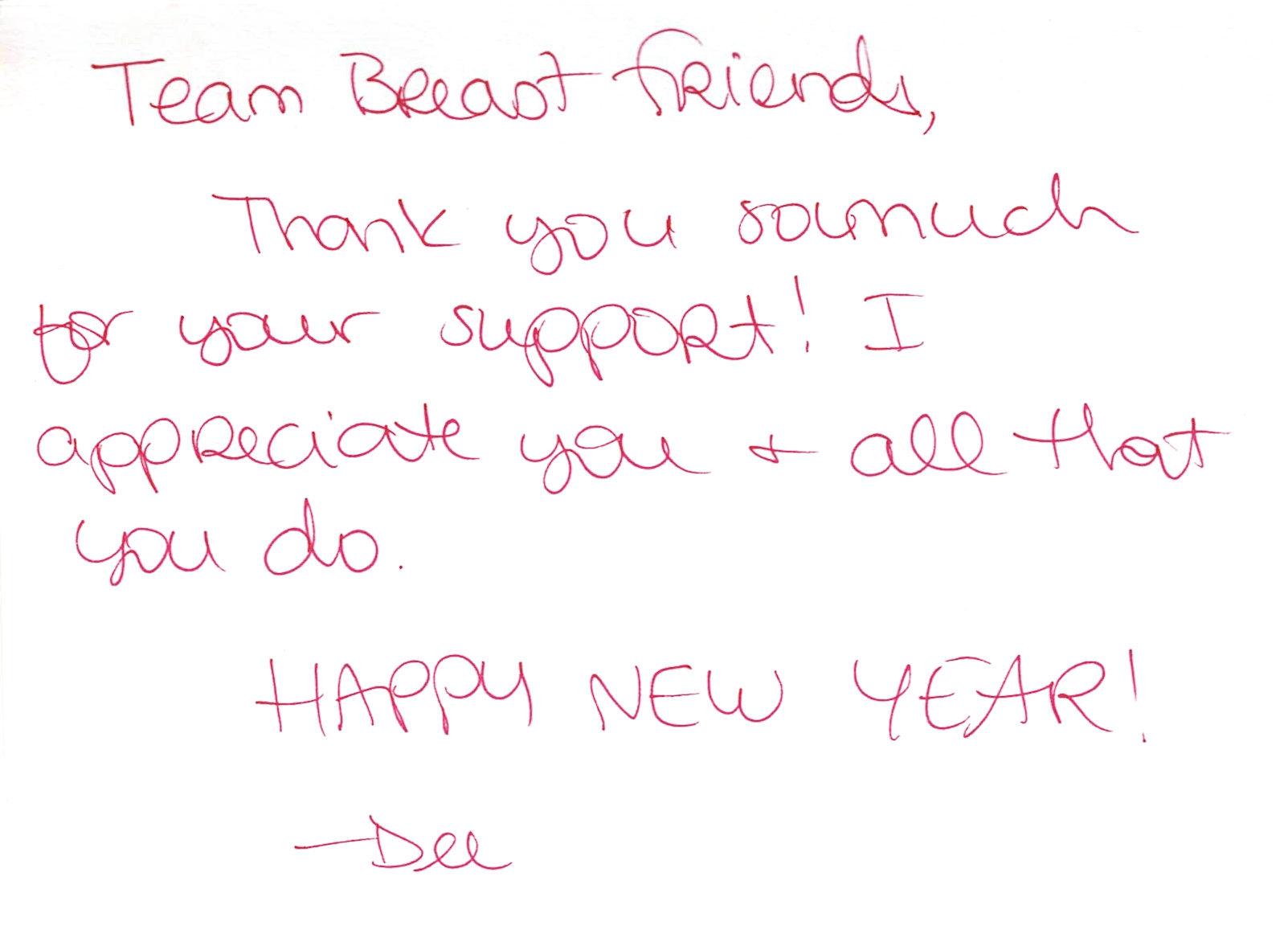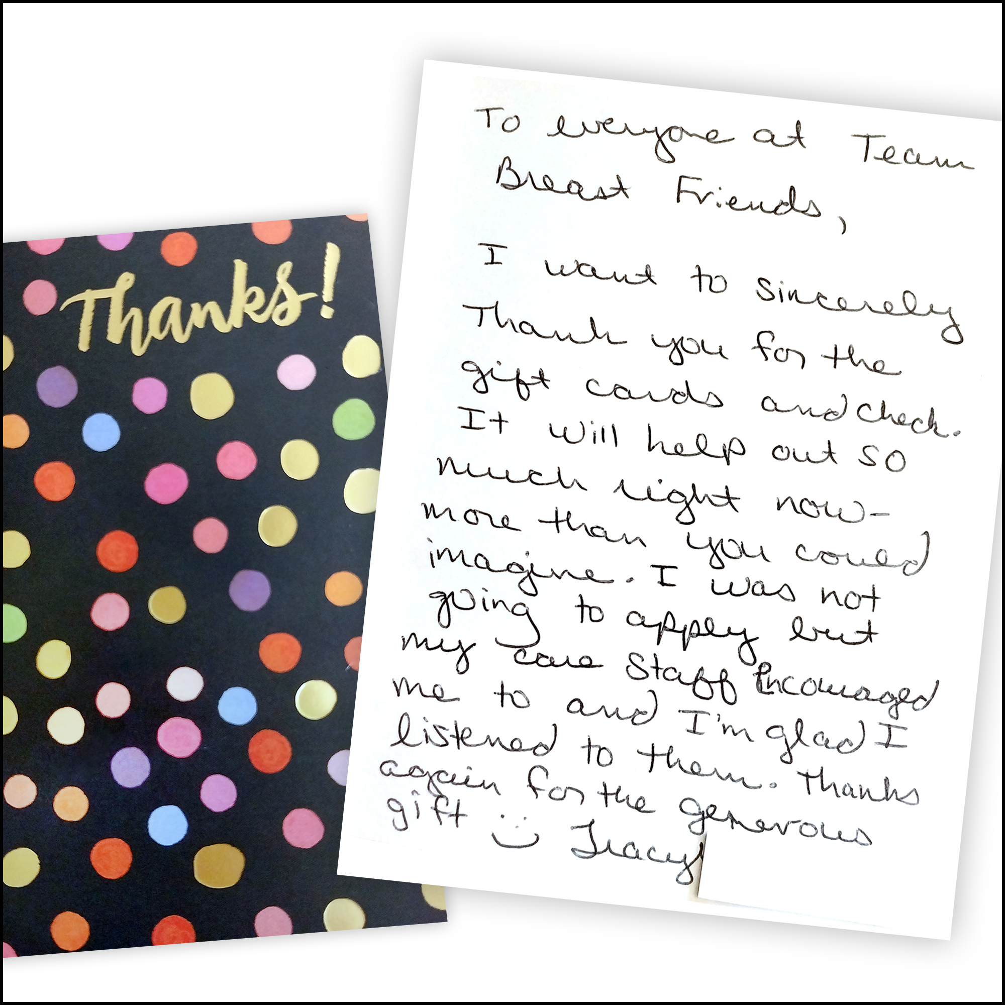 At Team Breast Friends, our mission is to provide support and hope to those battling breast cancer. We are honored to share some touching thank-you letters from survivors who have received financial assistance through our grant program. These heartfelt messages are a testament to the difference your support makes in the lives of those fighting this disease.